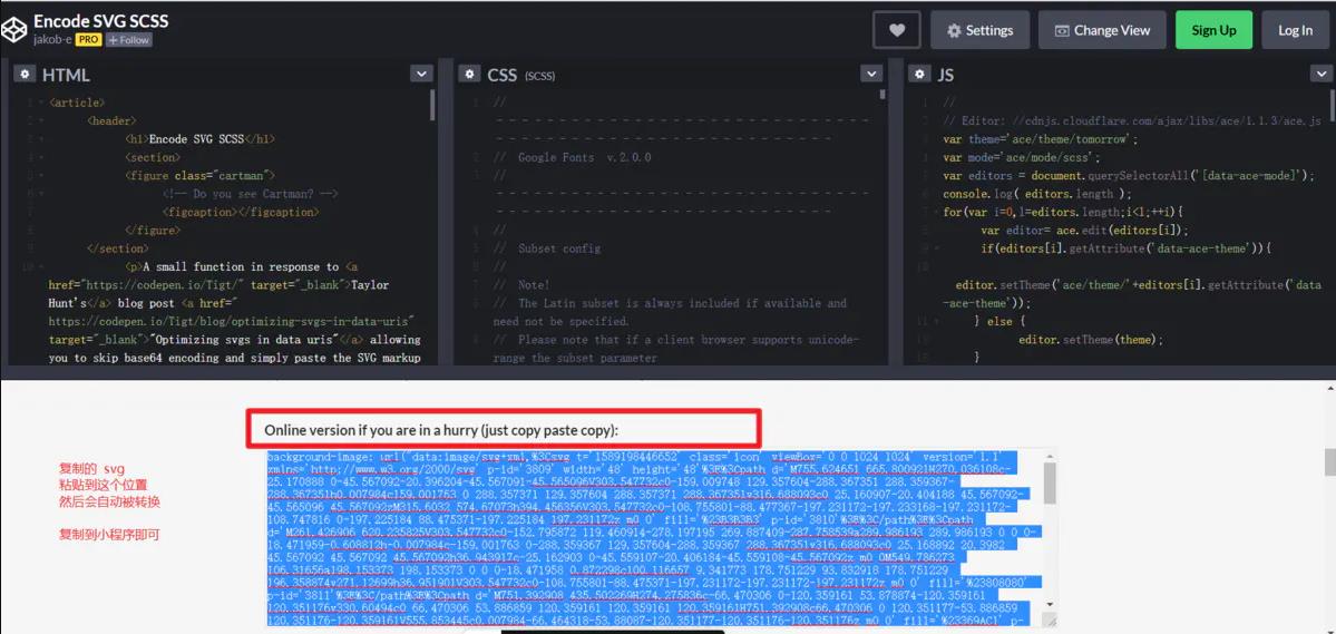 復制 svg 代碼 注意這里直接使用該url在小程序中是不行的,存在編碼錯誤 下面是一個轉編碼的網站