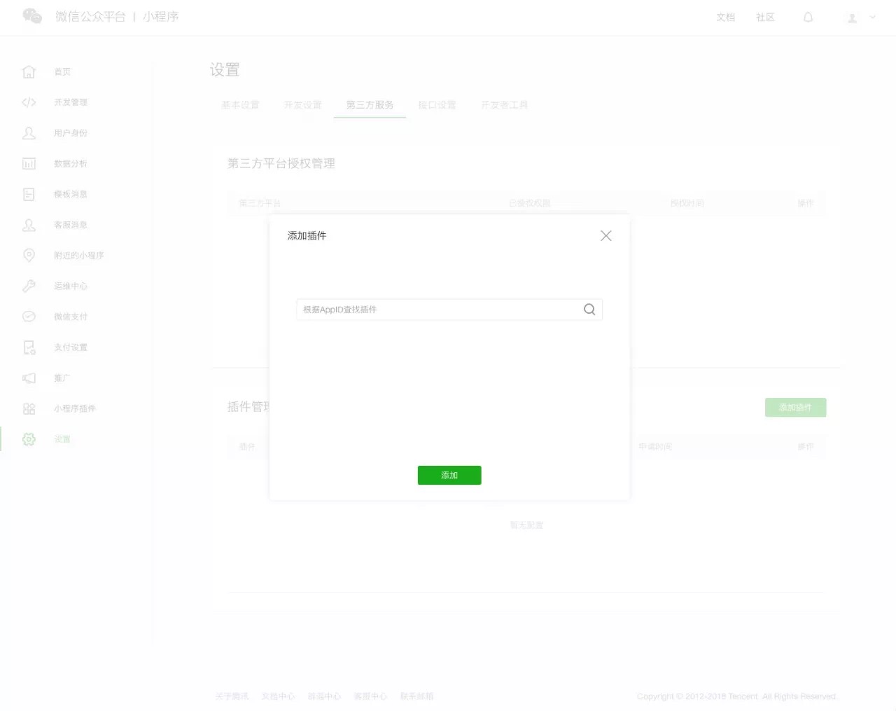 使用第三方插件之前,需要進入微信小程序開發(fā)者后臺,在第三方服務(wù)里添加插件: