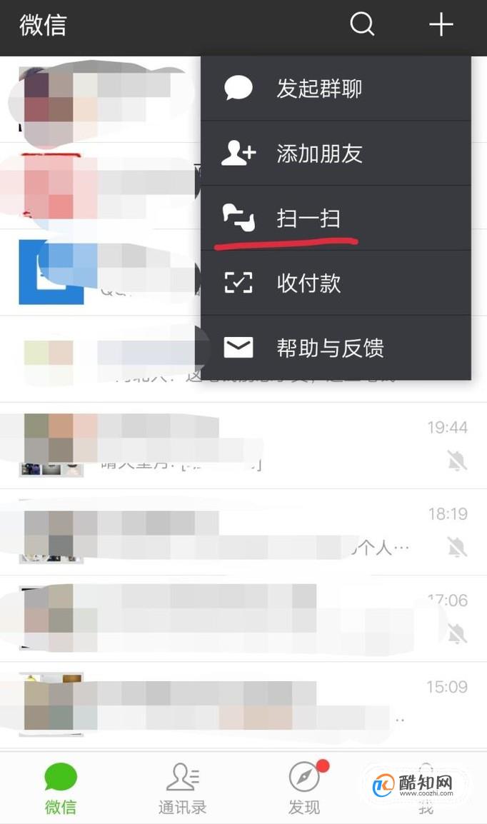 還有就是有小程序碼圖片的時候,我們可以打開微信,點擊右上角的“+”,如下圖。